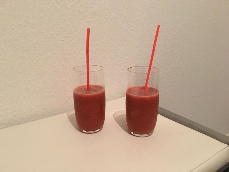 Erdbeeren, Pfirsiche und Grenadine in den Mixer und 30 Sekunden auf Stufe 10 mixen. Danach für ca. 5 Minuten stehenlassen.