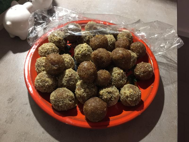 Orange waschen, fein schälen und auspressen. Orangenschale mit Mandeln 10 Sek/Stufe 10 fein mahlen. 50 g davon zum Wälzen der Kugeln zur Seite stellen. Datteln, Vanille und Zimt auf 15 Sek./Stufe 10 zerkleinern. Den O-Saft (ca. 6 EL) zugeben und 10 Sek/Stufe 3 vermischen. Kurze Zeit zum Durchziehen in den Kühlschrank stellen. Je 1 TL von der Masse zu einer Kugel mit ca. 3 cm Durchmesser formen. In den frisch geriebenen Mandeln wälzen. |